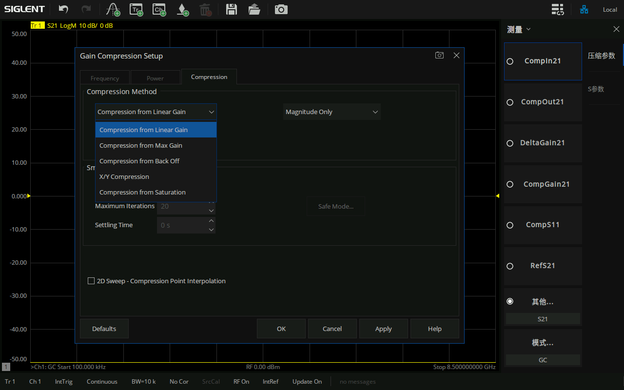 增益壓縮測(cè)量功能通過(guò)功率校準(zhǔn)和校準(zhǔn)向?qū)Т_保測(cè)量精度,支持多種掃描方法,包括智能掃描、每個(gè)頻率點(diǎn)的功率掃描和每個(gè)功率點(diǎn)的頻率掃描以適應(yīng)不同的測(cè)試場(chǎng)景、同時(shí)提供線性壓縮、最大增益壓縮、回退壓縮、X/Y壓縮、飽和態(tài)壓縮等多種壓縮方法,靈活應(yīng)對(duì)復(fù)雜的測(cè)試需求,確保全面、準(zhǔn)確地表征器件的非線性行為。
