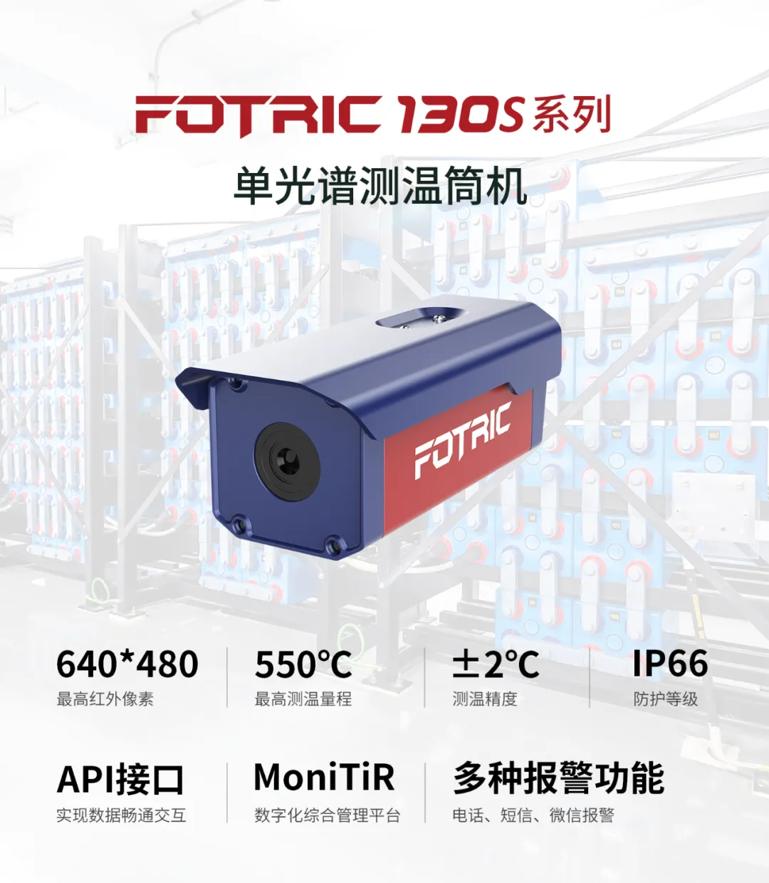 試驗(yàn)中所用在線式熱像儀——FOTRIC 130S系列單光譜測(cè)溫筒機(jī),是一款集測(cè)溫與成像功能于一體的先進(jìn)監(jiān)控設(shè)備。具備強(qiáng)大的防護(hù)能力,可在各種復(fù)雜的戶外環(huán)境中穩(wěn)定運(yùn)行,提供精確的溫度數(shù)據(jù)和清晰的紅外圖像及視頻,為用戶提供全面的監(jiān)控解決方案。此外,測(cè)溫筒機(jī)采用小型化設(shè)計(jì),安裝簡(jiǎn)單快捷,同時(shí)功耗低,不僅能降低能耗節(jié)約成本,還能確保長(zhǎng)時(shí)間工作的穩(wěn)定性。
