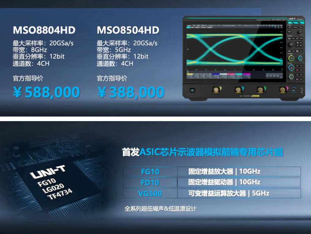 今年3月與9月,優(yōu)利德舉行“融合聚變 芯向未來”測試儀器新品發(fā)布會,重磅發(fā)布了最高8GHz帶寬、20GSa/s采樣率、12bit垂直分辨率的高帶寬高分辨率示波器MSO8000HD系列,最高1GHz帶寬、5GSa/s采樣率、12bit垂直分辨率的高分辨率示波器MSO5000HD系列,以及頻率范圍9kHz至22GHz的射頻模擬信號發(fā)生器USG5000M系列等高端儀器新品,標(biāo)志著優(yōu)利德在儀器高端化發(fā)展道路上實(shí)現(xiàn)了新的飛躍。在芯片方面,公司今年發(fā)布了示波器模擬前端專用芯片組,分別為固定增益放大器FG10、固定增益驅(qū)動(dòng)器FD10和可變增益運(yùn)算放大器VG500,實(shí)現(xiàn)了全系列超低噪聲與低溫漂設(shè)計(jì),標(biāo)志著公司成功突破了帶寬瓶頸,在儀器關(guān)鍵芯片自主可控方向邁出重要一步。