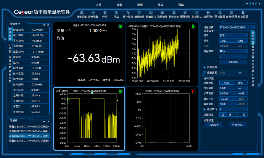 全新升級(jí)的電腦端功率測(cè)量顯示軟件支持多達(dá)四個(gè)探頭,可同時(shí)通過PoE交換機(jī)連接至計(jì)算機(jī)并進(jìn)行測(cè)量結(jié)果的顯示,包含數(shù)值顯示窗口、脈沖跡線窗口、統(tǒng)計(jì)跡線窗口和數(shù)據(jù)統(tǒng)計(jì)窗口,其中新增加的數(shù)據(jù)統(tǒng)計(jì)窗口用于顯示一段時(shí)間內(nèi)信號(hào)的實(shí)時(shí)功率變化曲線,并將曲線數(shù)據(jù)保存在文件中,可隨時(shí)打開歷史記錄數(shù)據(jù)文件進(jìn)行查看。
