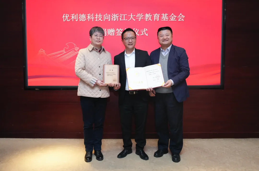 儀式上,洪少俊、陳振華、彭列平分別代表優(yōu)利德科技、浙江大學(xué)教育基金會(huì)和浙江大學(xué)電氣工程學(xué)院簽署捐贈(zèng)協(xié)議,陳振華與彭列平為洪少俊頒發(fā)捐贈(zèng)證書和銘牌。