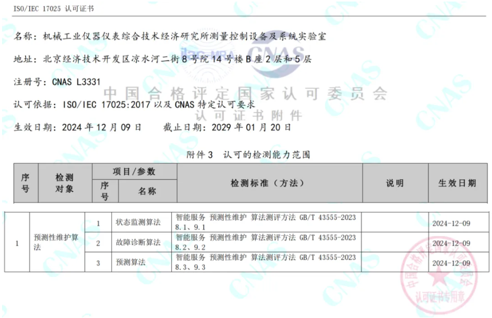 2024年12月9日,機(jī)械工業(yè)儀器儀表綜合技術(shù)經(jīng)濟(jì)研究所(以下簡稱儀綜所)依托測(cè)量控制設(shè)備及系統(tǒng)實(shí)驗(yàn)室申請(qǐng)的預(yù)測(cè)性維護(hù)算法測(cè)評(píng)資質(zhì)認(rèn)可申請(qǐng)正式獲批,成為預(yù)測(cè)性維護(hù)測(cè)評(píng)領(lǐng)域國內(nèi)首個(gè)且惟一的獲得中國合格評(píng)定國家認(rèn)可委員會(huì)(CNAS)實(shí)驗(yàn)室認(rèn)可證書及檢驗(yàn)檢測(cè)機(jī)構(gòu)資質(zhì)認(rèn)定證書(CMA)的第三方權(quán)威檢測(cè)機(jī)構(gòu)。