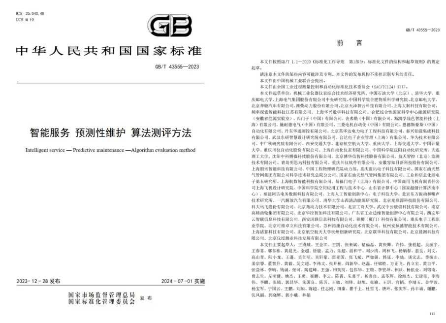預(yù)測(cè)性維護(hù)算法測(cè)評(píng)服務(wù)以GB/T 43555-2023 《智能服務(wù) 預(yù)測(cè)性維護(hù) 算法測(cè)評(píng)方法》為依據(jù),通過15項(xiàng)指標(biāo)對(duì)狀態(tài)監(jiān)測(cè)、故障診斷、預(yù)測(cè)算法的各項(xiàng)性能進(jìn)行定量測(cè)試及定性評(píng)價(jià),科學(xué)合理的評(píng)價(jià)預(yù)測(cè)性維護(hù)算法性能。該標(biāo)準(zhǔn)基于國家重點(diǎn)研發(fā)計(jì)劃《精密加工核心部件性能參數(shù)在線監(jiān)測(cè)與質(zhì)量保障技術(shù)研究》(2021YFF0603400)等項(xiàng)目支持,由儀綜所牽頭,組織清華大學(xué)、西門子(中國)有限公司等70余家單位的110余位專家共同制定,由全國工業(yè)過程測(cè)量控制和自動(dòng)化標(biāo)準(zhǔn)化技術(shù)委員會(huì)(SAC/TC124)歸口。