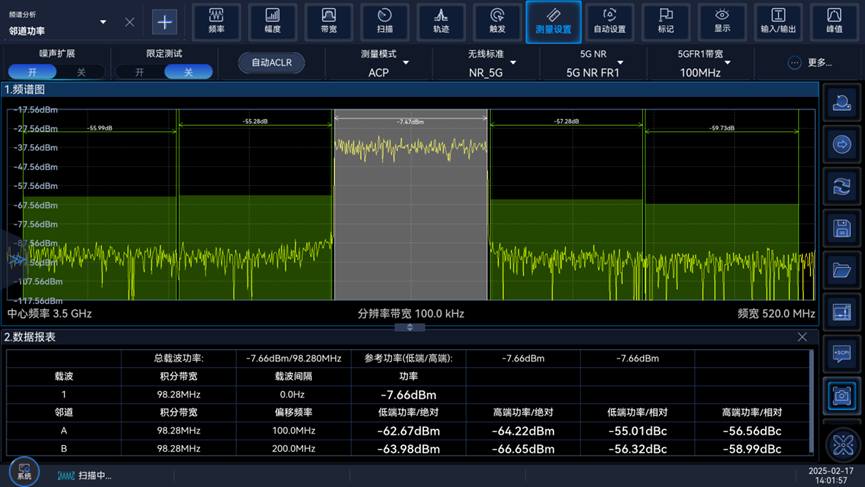 ACLR測(cè)試結(jié)果(5GNR FR1,100MHz,256QAM,30kHz SCS,3.5GHz)