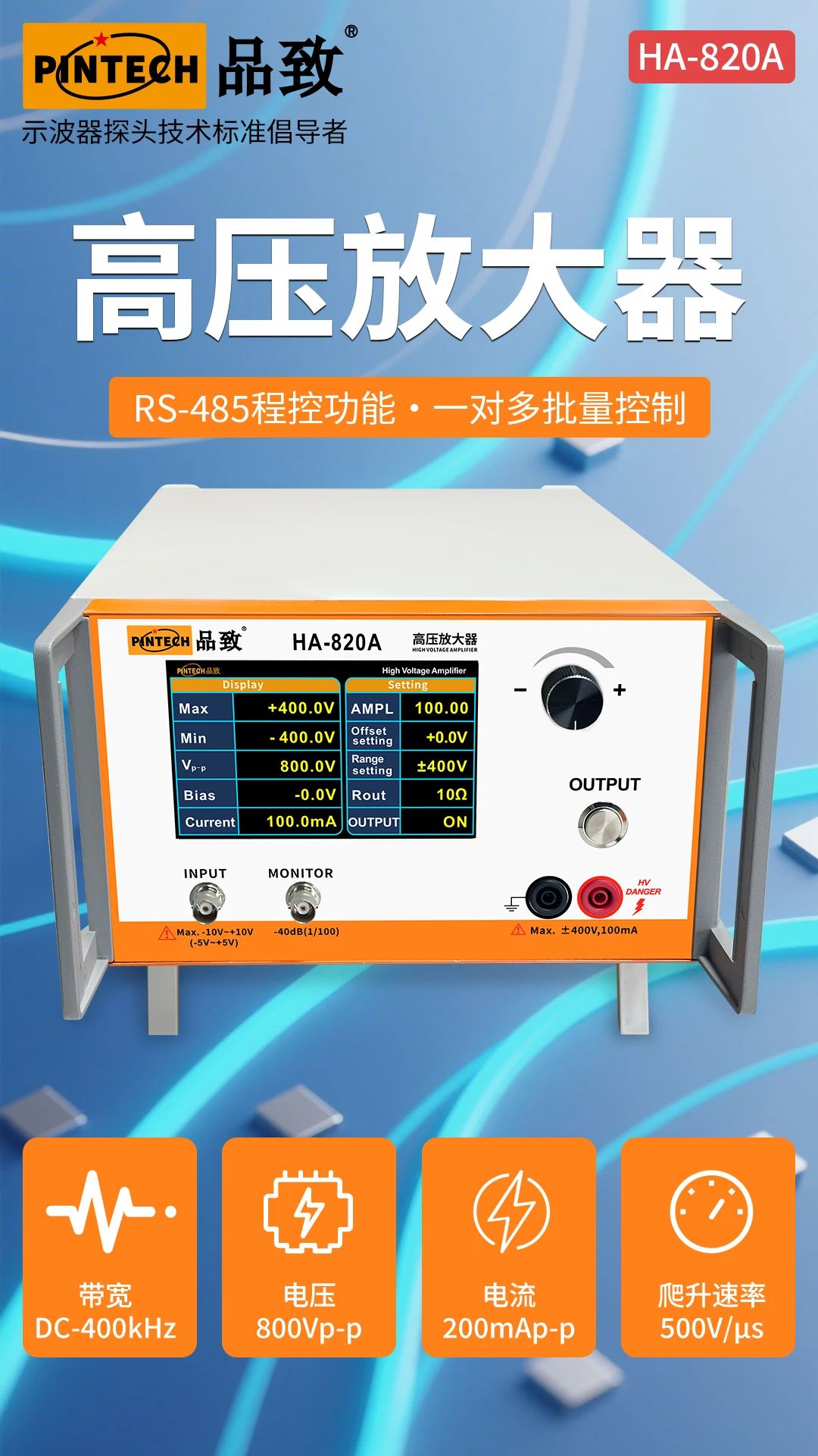 HA-820A是一款操作簡單、應用范圍廣的程控高壓放大器,支持0~100倍的電壓增益,電壓輸出范圍為-400V~+400V,當輸出基準電壓 400Vp-p 時,帶寬高達 400kHz,壓擺率達到500V/μs,可通過通信接口實現(xiàn)自動調整放大器輸出增益、偏置等參數(shù)。