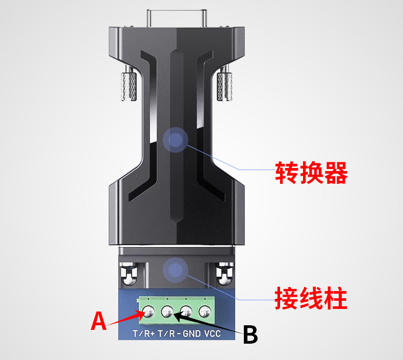 上位機端的端口這里使用485轉接器(圖為232轉485轉換器,僅做接線演示),用戶根據(jù)需要自備合適的RS-485轉換器。對于485的DB-9接口,不同廠家生產的轉換器的引腳定義可能不同,廠家一般會贈送一個DB-9接線柱,將需要使用的引腳引出。這里以紅色線代表A,黑色線代表B,從轉換器中接出通信線。