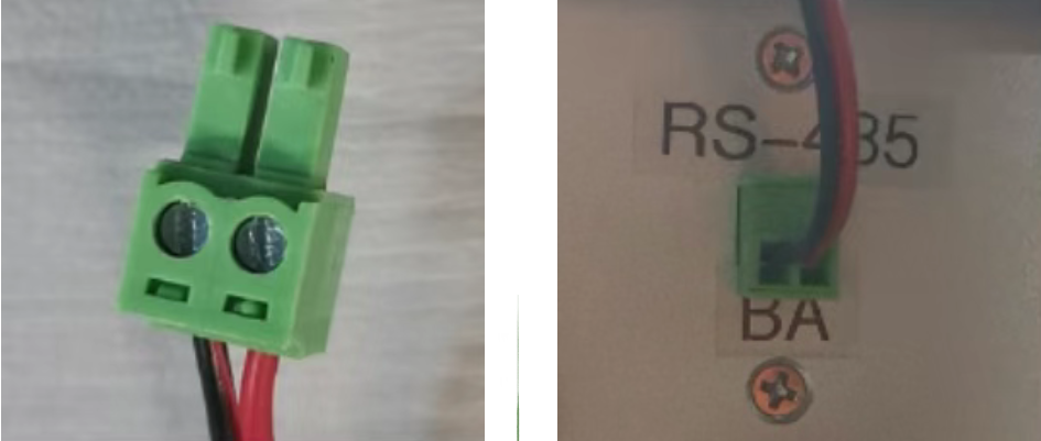 以紅色線代表A,黑色線代表B,下位機端接線如圖(螺絲朝上,紅線接到右孔,黑線接到左孔)。