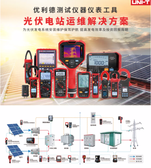 該方案聚焦光伏系統(tǒng)運(yùn)行中的關(guān)鍵檢測(cè)環(huán)節(jié),涵蓋組件性能測(cè)試、匯流箱絕緣檢測(cè)、逆變器效率分析、電能質(zhì)量監(jiān)測(cè)以及變壓器溫度篩查等多個(gè)核心場(chǎng)景。配套產(chǎn)品包括UT673PV光伏組件最大功率測(cè)試儀、UT503PV光伏絕緣電阻測(cè)試儀、UT196光伏專業(yè)數(shù)字萬用表、UT219PV專業(yè)交直流鉗形表、UT568B聲學(xué)成像儀、UTi384G紅外熱成像儀、UT278B地樁式接地電阻測(cè)試儀……這些產(chǎn)品在功能設(shè)計(jì)上充分考慮了光伏現(xiàn)場(chǎng)復(fù)雜多變的應(yīng)用環(huán)境,具備高精度測(cè)量、強(qiáng)抗干擾能力和操作便捷性等特點(diǎn),能夠有效支撐運(yùn)維人員快速定位問題、提升診斷效率、優(yōu)化系統(tǒng)性能,實(shí)現(xiàn)運(yùn)維的降本增效。