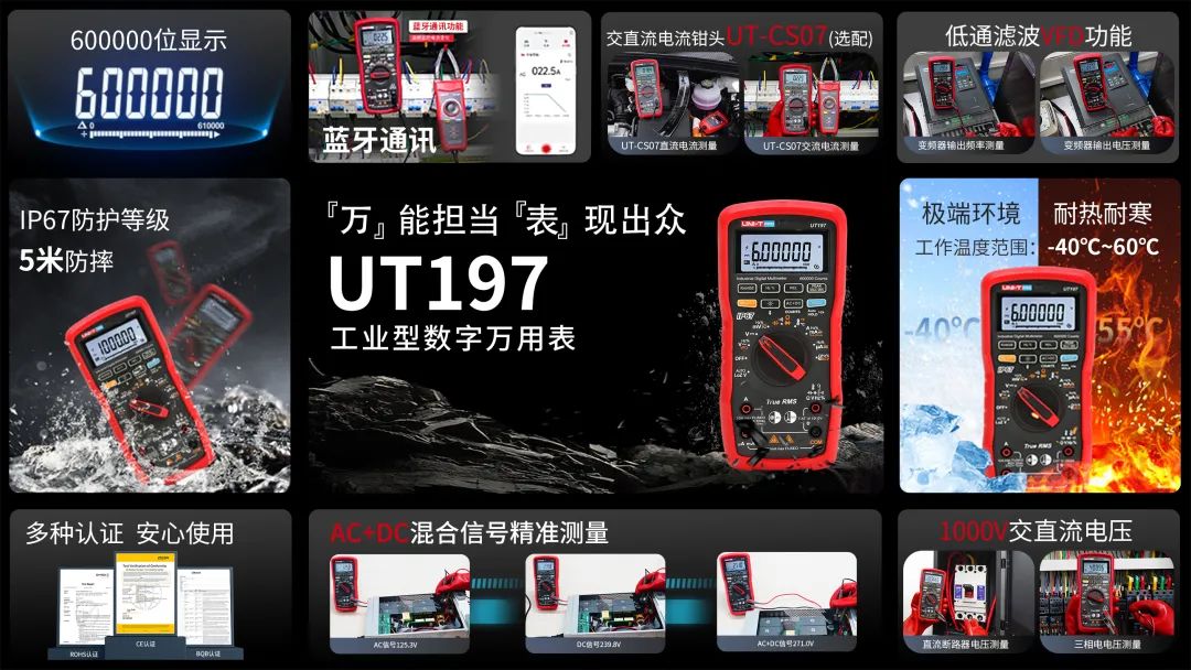 UT197是一款專為工業(yè)及戶外惡劣環(huán)境打造的高精度真有效值手持式數(shù)字萬用表。產(chǎn)品具備600000位的計(jì)數(shù)顯示模式(僅直流電壓擋)。工作溫度范圍寬廣,從-40°C至60°C均能穩(wěn)定工作。不僅能夠測量高達(dá)1000V的交直流電壓,還可通過外掛交直流鉗UT-CS07,將電流量程擴(kuò)展至1000A。此外,其IP67防護(hù)等級設(shè)計(jì)與5米防摔設(shè)計(jì),進(jìn)一步提升了產(chǎn)品的可靠性與耐用性,確保在復(fù)雜多變的環(huán)境中依然能夠保持高精度與穩(wěn)定性,可廣泛應(yīng)用于電力、新能源、工業(yè)及光伏等領(lǐng)域。