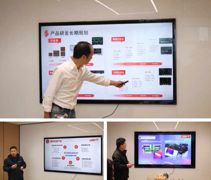 隨后的技術(shù)交流環(huán)節(jié)精彩紛呈。華西區(qū)測(cè)試儀器銷(xiāo)售總監(jiān)潘俊安系統(tǒng)介紹了優(yōu)利德在電子測(cè)試儀器領(lǐng)域的產(chǎn)品布局,重點(diǎn)闡述了多款設(shè)備在測(cè)量精度、環(huán)境適應(yīng)性和場(chǎng)景應(yīng)用方面的技術(shù)特點(diǎn)。測(cè)試儀器市場(chǎng)部工程師張亞博詳細(xì)分享了MSO8000HD系列高分辨率示波器在信號(hào)完整性方面的運(yùn)用,以及UTS7000A系列信號(hào)分析儀在射頻領(lǐng)域的運(yùn)用。他還透露,公司將于年底推出一系列測(cè)試儀器,以更好地滿足工業(yè)、科研、新能源等領(lǐng)域?qū)Ω呔葴y(cè)量的需求。
