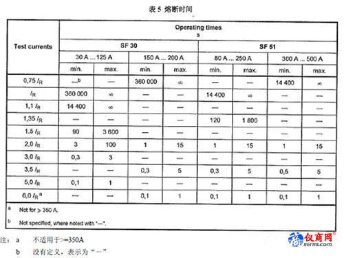 下圖摘自ISO8820-1_2007國標(biāo)中針對SF30和SF51的熔斷測試要求,熔斷時間需在過載電流從1.1IR~6.0IR范圍內(nèi)測試,當(dāng)過載電流越大,熔斷時間越快。若以500A的熔斷器來看,6IR意味著過載電流的需要達(dá)到3000A,并在此條件下測得熔斷時間。