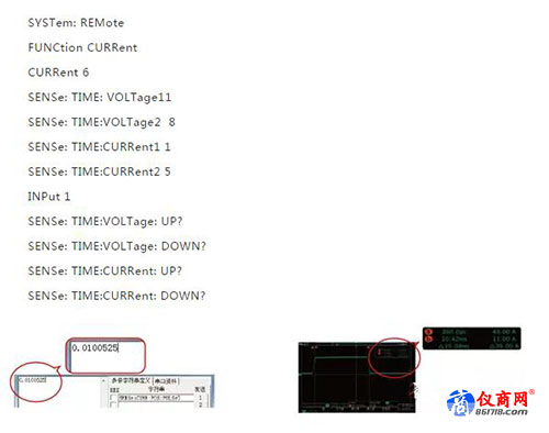 量測時間的測定通過上位機軟件發(fā)送指令,例如,測試電源電壓從1V到8V,電流從1A到5A的上升和下降時間,可以發(fā)送如下指令:
