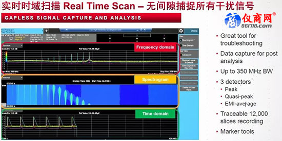 全面的信號(hào)可視化,其中實(shí)時(shí)掃描(RTS)在高達(dá)350MHz的帶寬內(nèi)提供無間隙的信號(hào)捕獲和分析,并同時(shí)顯示頻域、時(shí)域和頻譜圖,配合三個(gè)EMC檢波器,使客戶可以更好地了解其關(guān)心的信號(hào)。