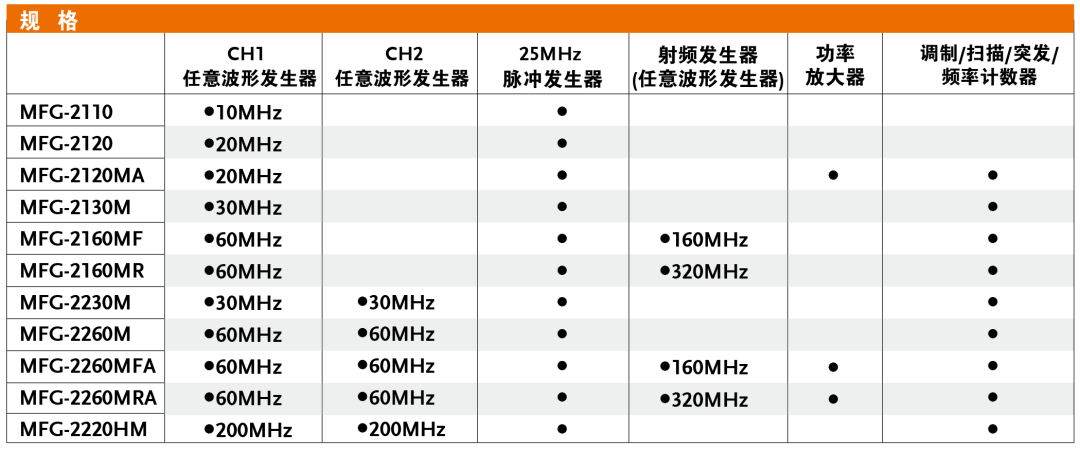 MFG-2000系列信號源不同于傳統(tǒng)的單通道或雙通道結(jié)構(gòu)。用戶可根據(jù)需要從MFG-2000系列中選擇最多5個通道同時輸出,包括CH1、CH2兩個等性能任意波通道;一臺320MHz射頻信號源;一個25MHz脈沖發(fā)生器和一個功率放大器。
