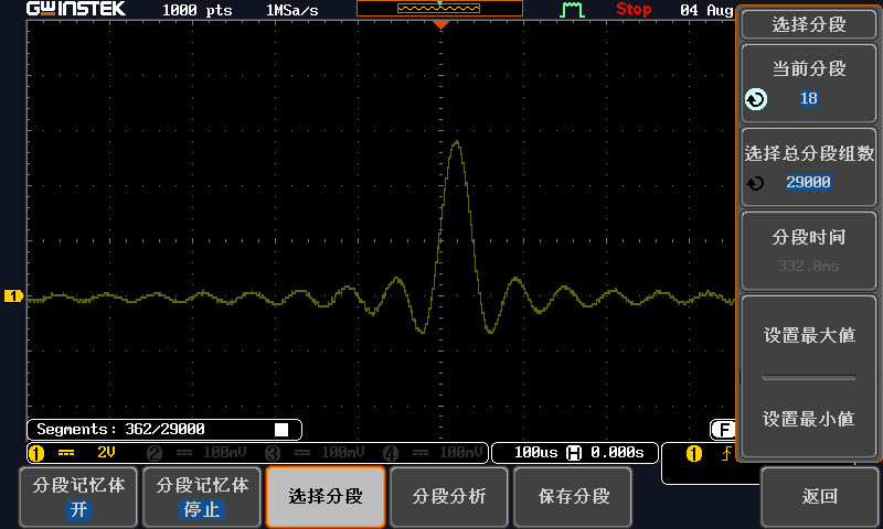 示波器分段存儲(chǔ)功能,此功能是通過(guò)將示波器的的記錄存儲(chǔ)器分割成較小的分段記憶體,示波器可以在保證高采樣率的情況下,連續(xù)捕獲滿足設(shè)定條件的多個(gè)波形,保證信號(hào)的完整性也不會(huì)有過(guò)多的靜默信號(hào)帶來(lái)分析的困擾。例如固緯電子MDO-2000E系列示波器就內(nèi)建了分段存儲(chǔ)功能,最大可以將記錄長(zhǎng)度分割成29000組,設(shè)定好觸發(fā)條件后就可以自動(dòng)連續(xù)的抓取所需的波形。