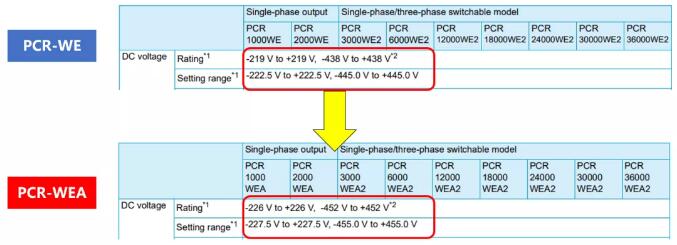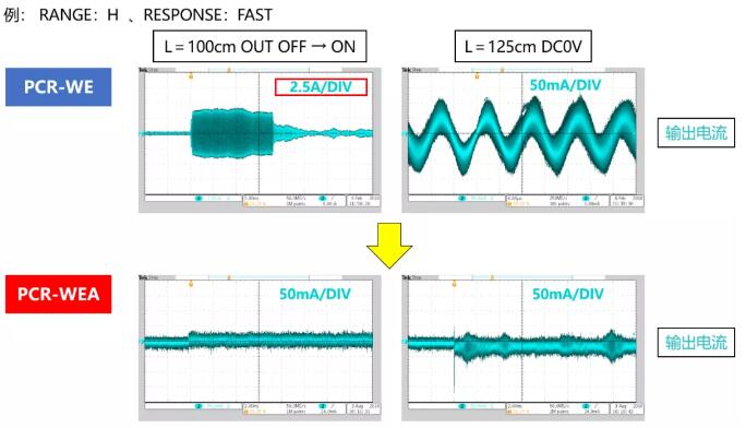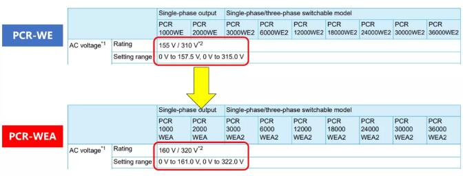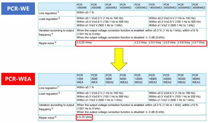 PCR-WEA/WEA2系列所有機(jī)型規(guī)格的紋波噪聲全部低于0.25Vrms。此改善原因,不是因?yàn)殡娐犯淖?。而是根?jù)PCR-WE/WE2系列的有效值而發(fā)生的規(guī)格改變。