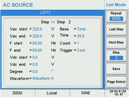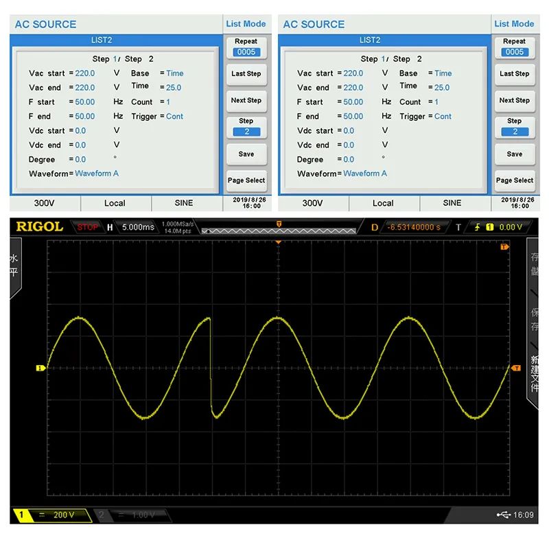 APM高性能可編程交流電源的LIST功能不僅可以提供多種波形編輯模式來(lái)模擬各種電源干擾狀況且可以實(shí)現(xiàn)交流和直流輸出之間的轉(zhuǎn)換可瞬時(shí)發(fā)生,通過(guò)LIST編輯從AC 到DC 模式的轉(zhuǎn)換發(fā)生可以在正弦波的90°點(diǎn),只需要設(shè)置起始相位角為90°即可。這種設(shè)置非常靈活,我們可以使AC 到DC 轉(zhuǎn)換發(fā)生在交流波形的正峰值處,從而無(wú)縫過(guò)渡,提高了能源效率。