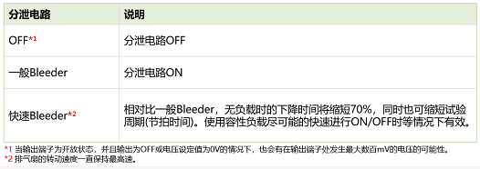 對(duì)于電池與電容器等的容性負(fù)載進(jìn)行充電后,希望維持滿充電的狀態(tài)時(shí),可將分泄電路設(shè)為OFF,減少?gòu)?qiáng)制放電。在沒(méi)有此項(xiàng)功能前,用戶需要將二極管串聯(lián)在輸出,從而防止放電。