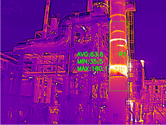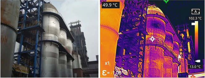 隨著熱風爐爐殼和拱頂長時間工作,表面耐火材料會出現(xiàn)變薄和脫落問題。使用紅外熱像儀可設置測溫區(qū)域,實時獲取重點部位溫度分布情況,提前處理設備隱患。