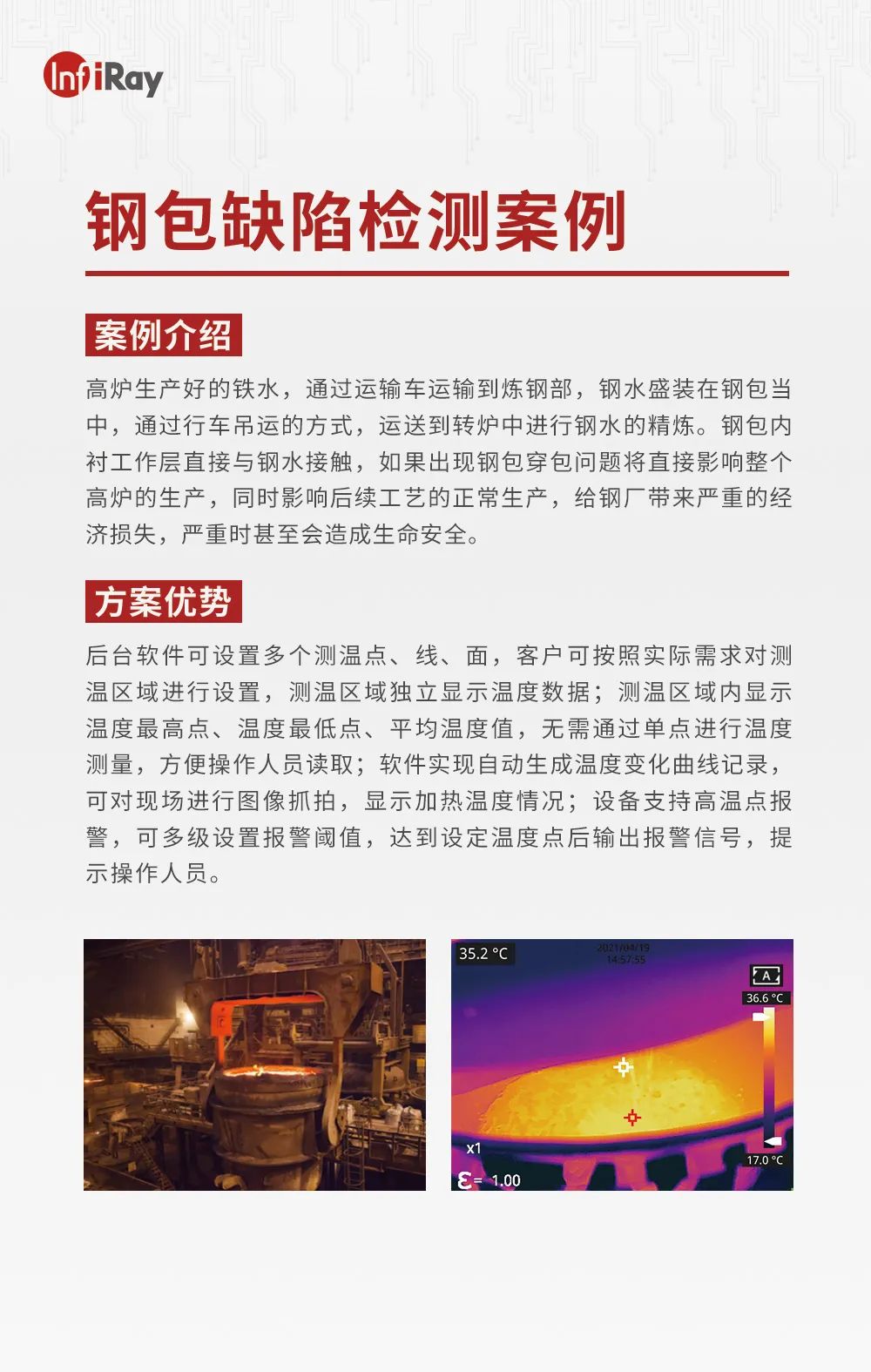 使用紅外熱像儀可以將缺陷點自動定位,提供異常溫度報警,保障設備安全,排除鐵水包穿包隱患。