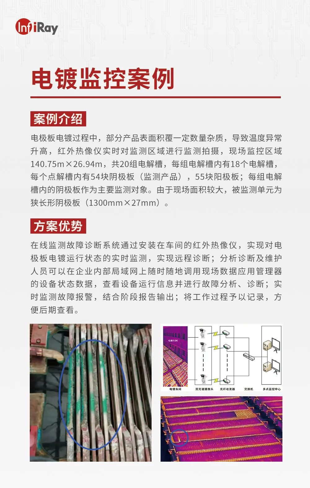 在提純處理時,經(jīng)常會有金屬雜質富集在電極板之間,從而造成短路,引發(fā)設備故障。傳統(tǒng)的人工手動巡檢,效率落后,易漏檢誤檢。利用紅外熱像儀可全面、快速掃視測溫目標,自動捕捉高溫點,幫助工作人員迅速定位熱缺陷部位,提高檢修效率,降低維護成本,確保生產(chǎn)安全。
