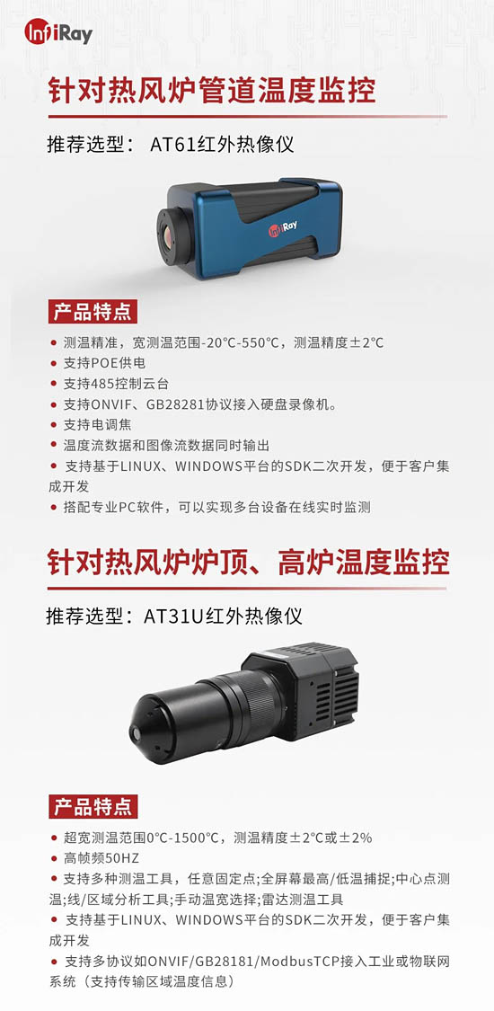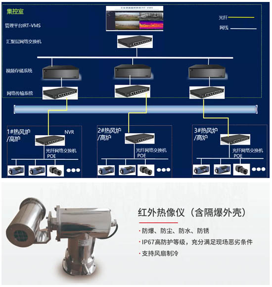 3、三套高爐,每套配置4座熱風爐,每座熱風爐熱風出口管道與熱風總管道連接處需3臺紅外熱成像設(shè)備覆蓋整個接觸面,實現(xiàn)對整個管道面的全覆蓋及在線實時監(jiān)控關(guān)鍵區(qū)域的溫度