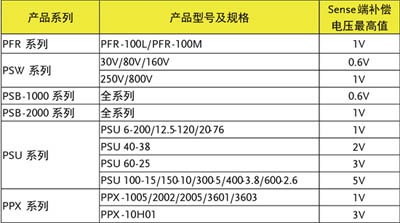 在高精度的測(cè)試或者線纜很長(zhǎng)的場(chǎng)合,就需要Sense端發(fā)揮作用,我們用Sense+和Sense-同樣連接到負(fù)載的輸入端,去補(bǔ)償線纜Rcable產(chǎn)生的壓降(原理其實(shí)十分簡(jiǎn)單)。典型的Sense補(bǔ)償范圍是0.6V至幾V以內(nèi),最好查看電源產(chǎn)品的使用手冊(cè)來(lái)確定這個(gè)補(bǔ)償范圍是否能滿足實(shí)際應(yīng)用的要求。臺(tái)灣固緯品牌直流電源的Sense補(bǔ)償范圍統(tǒng)計(jì)如下: