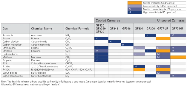 一臺(tái)FLIR熱像儀能夠可視化一種特定的氣體,但它無(wú)法可視化另一種具有截然不同的紅外吸收特性的氣體。這就是為什么FLIR擁有一系列用于檢測(cè)各種氣體的OGI熱像儀。您可以使用此圖表來(lái)確定哪種GF型號(hào)的FLIR熱像儀最符合您的應(yīng)用。仔細(xì)查看下面的表格,您就可以找到最適合的FLIR OGI熱像儀!