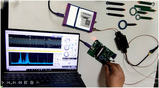 圖上這個EMI測試系統(tǒng)由電磁近場探頭和射頻模塊以及LOTO示波器組成,正在測PCB電路上的DC電源模塊周邊的電磁干擾的頻譜分布,我們在文章后面會把整個的測試過程的視頻放出來。
