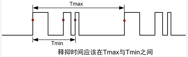 當(dāng)觸發(fā)點(diǎn)不固定時(shí),反映到示波器就是波形會(huì)不斷亂跳,此時(shí)AutoSetup無(wú)法自動(dòng)調(diào)整,所以無(wú)論怎樣Auto,也不一定能穩(wěn)定觸發(fā),此時(shí)需要調(diào)整觸發(fā)釋抑,實(shí)現(xiàn)復(fù)雜波形的穩(wěn)定顯示,它是限定本次觸發(fā)與下次觸發(fā)間最小間隔的時(shí)間量,通常用于隔離突發(fā)脈沖串,使觸發(fā)點(diǎn)固定于每幀數(shù)據(jù)的相同位置。如下圖所示: