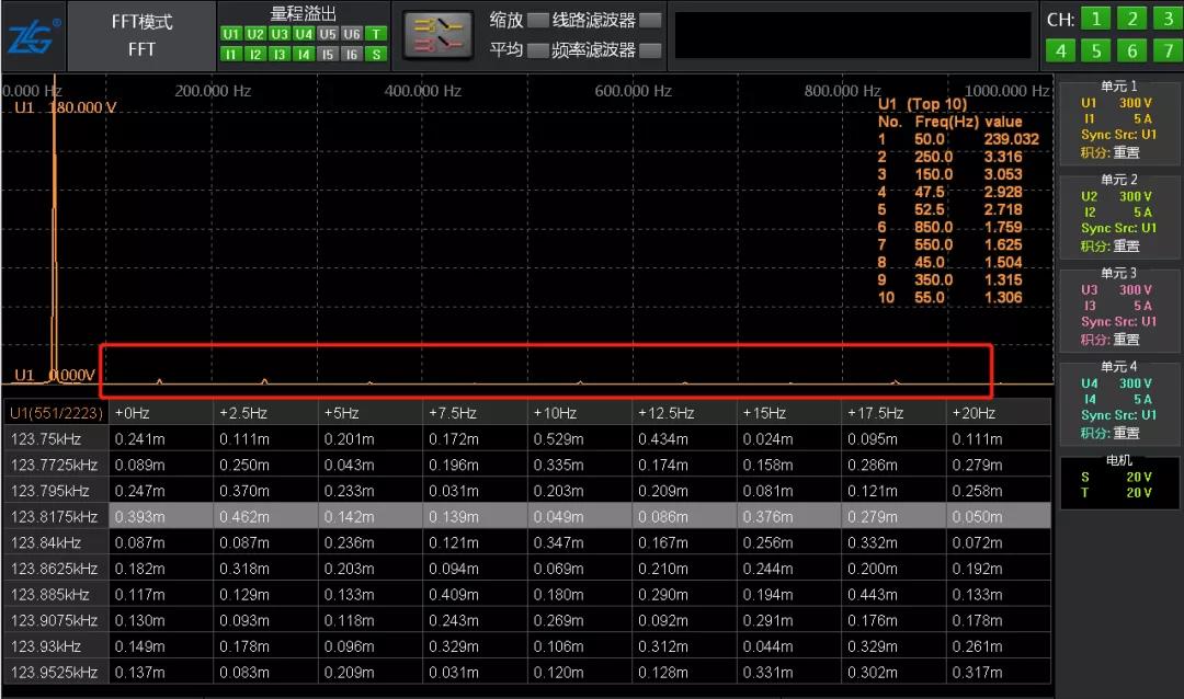 根據(jù)FFT視圖可以看到除了50Hz處,頻譜上還有很多諧波信號,這個是導(dǎo)致電壓超標(biāo)的主要原因,另外除了諧波成分,我們可以看到頻譜表上各個頻點的能量,這個也是電壓超標(biāo)的原因之一。