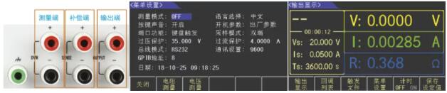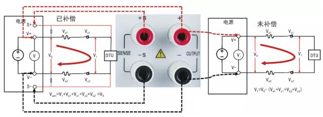 當儀器輸出電流較大、導線細長阻值較大,儀器輸出端到被測件的導線上會分得較大電壓,造成被測件兩端實際電壓小于儀器輸出電壓。使用遠端補償功能可以補償測試線上的壓降,保證被測件兩端電壓為實際設置的輸出電壓。