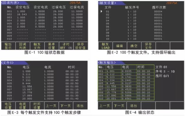 儀器回調列表中可儲存100組狀態(tài)數據,每組數據可設置電壓值、電流值、過保電壓和過保電流,需要時可在回調列表中直接調用(如圖E-1)。儀器還設計了100個觸發(fā)文件的快速調用功能(如圖E-2),每個觸發(fā)文件包含100個觸發(fā)步驟(如圖E-3)。每個觸發(fā)步驟可編輯輸出電壓、輸出電流、輸出時間,每個測試文件可編輯循環(huán)輸出的次數。當收到觸發(fā)信號時,電源按照測試文件的順序執(zhí)行輸出任務,并且在<觸發(fā)輸出>頁面顯示輸出狀態(tài)(如圖E-4)。