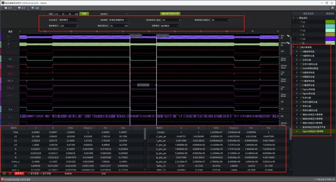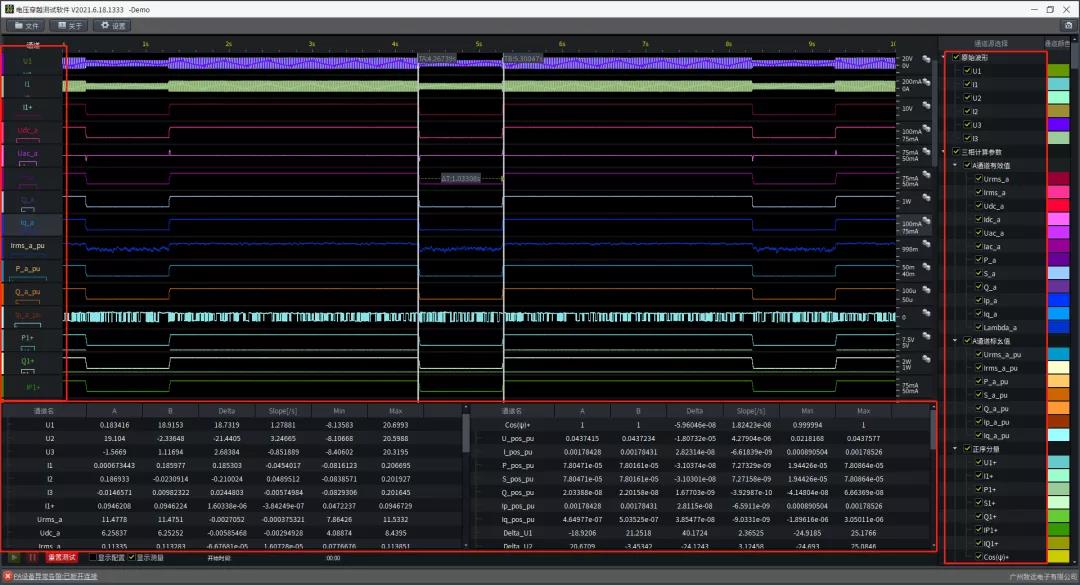 VRT 支持單相高低穿和三相高低穿,單相高低穿30余項計算項波形選擇;三相高低穿達(dá) 200 余項計算項波形選擇,實時可顯示當(dāng)前值、最大值、最小值和 Delta 值及斜率等測量項,并可通過光標(biāo)拖動實時計算更新。現(xiàn)在對測量菜單進(jìn)一步擴(kuò)展,一次可觀察多達(dá)16個波形數(shù)據(jù)測量項。