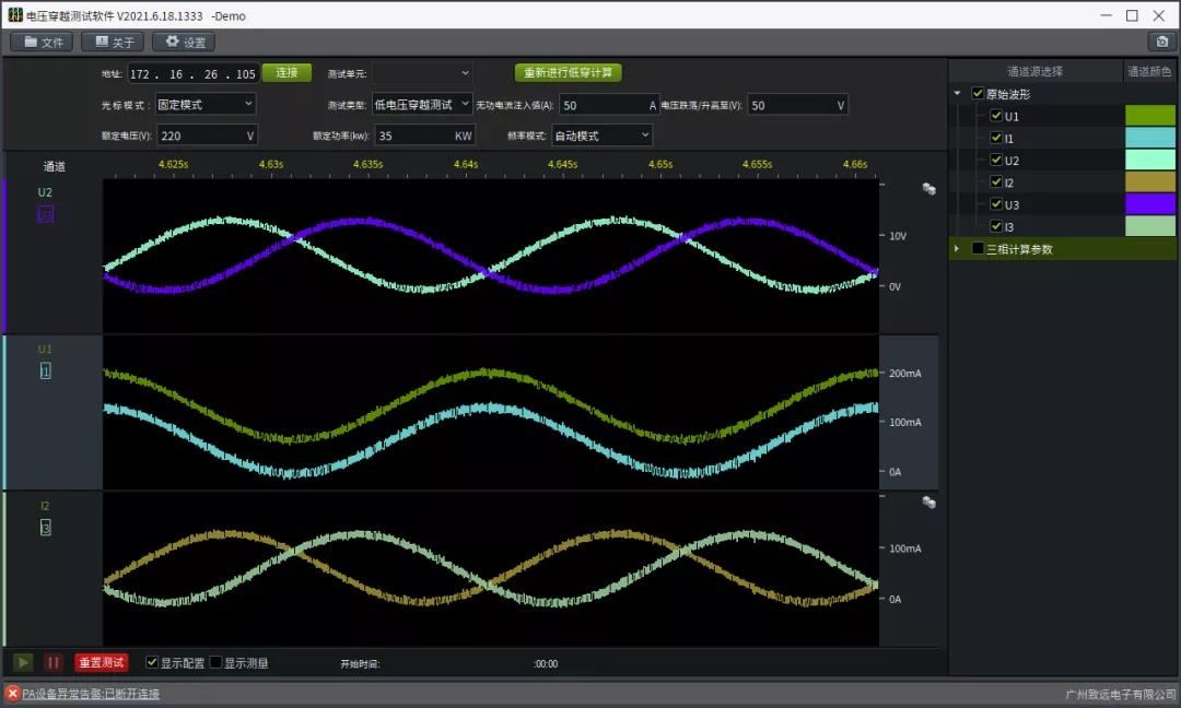 VRT電壓穿越測試軟件提供對低電壓穿越異常的模擬測試,通過連接PA功率分析儀實時采集電壓數(shù)據(jù),當(dāng)監(jiān)控電壓數(shù)據(jù)發(fā)生異常變化時,能夠直觀快速定位發(fā)現(xiàn)問題。