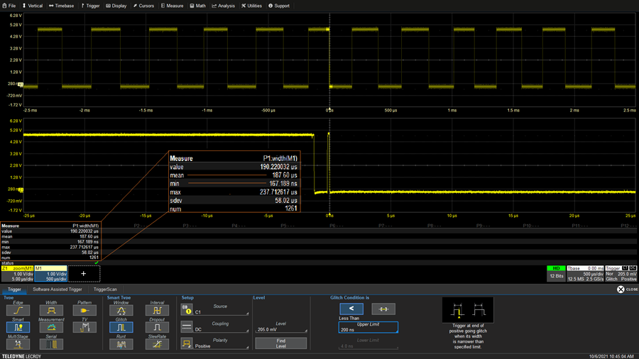 讓我們從一個簡單的毛刺開始,毛刺是一種虛假脈沖或尖峰,其持續(xù)時間通常比信號中的其他脈沖短得多。首先,我們必須要檢測毛刺的存在,最好的方法是將測量統(tǒng)計應(yīng)用于采集的大量波形——順便說一下,這是檢測任何類型異常的最佳方法。