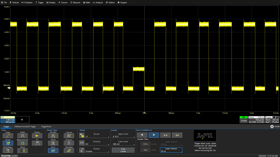 設(shè)置觸發(fā)器捕獲欠幅信號(低于可接受幅度的脈沖)的操作,與毛刺類似,如下圖所示,欠幅觸發(fā)器捕獲越過幅度下限但未能在指定時間內(nèi)越過上限的脈沖。