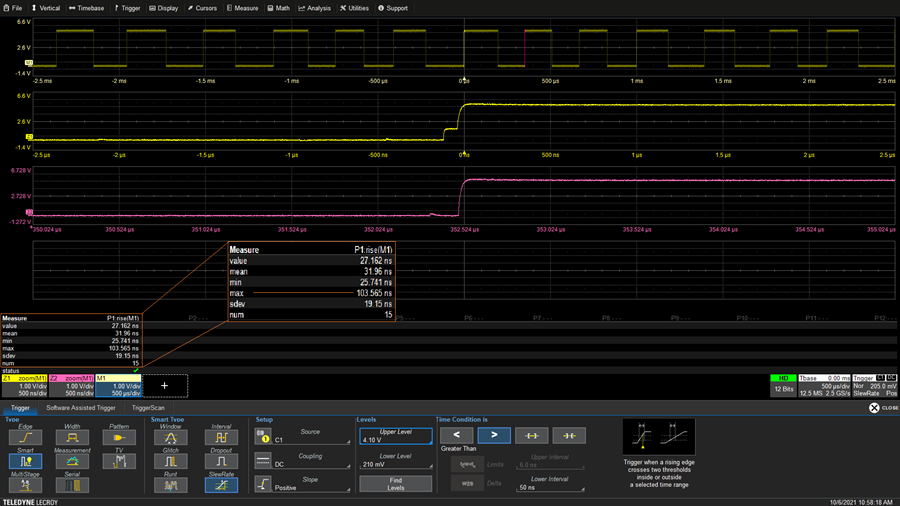 壓擺率觸發(fā)和上升時間(或下降時間)測量可用于查找上升或下降時間過慢的邊沿,在下圖中,測量到的上升時間最大值103.6ns 遠大于 31.96 ns 的平均值,表明在某處出現(xiàn)了比較緩慢的邊沿。