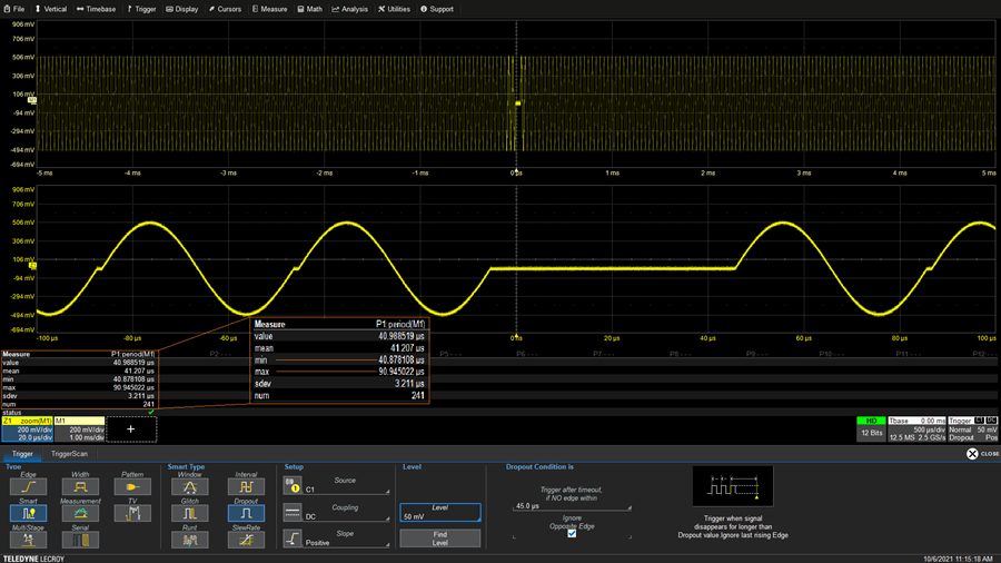 上圖中的放大波形 Z1 顯示了在觸發(fā)時間零點捕獲的緩慢邊沿,與正常邊沿Z2 相比,它具有明顯的階躍。