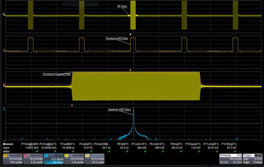 下面展示了最基本雷達(dá)信號(hào)的測(cè)量,如下圖所示,最上方M1是示波器采集到的雷達(dá)信號(hào),載波頻率是1GHz,下方的F1是使用Demodulate函數(shù)對(duì)雷達(dá)信號(hào)解調(diào)得到的幅度包絡(luò),粉色曲線F2是對(duì)單個(gè)脈沖解調(diào)后的結(jié)果,兩者疊加顯示在一起,