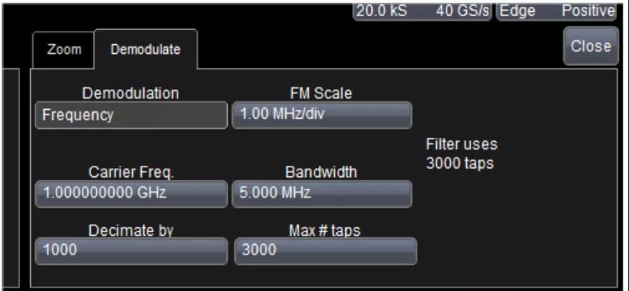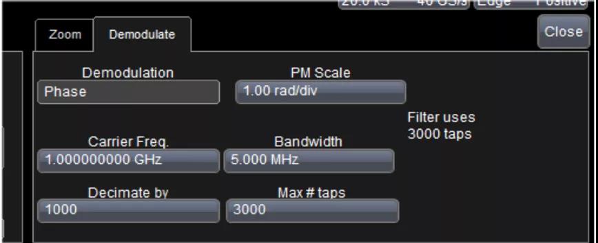 下圖顯示了Demodulate的設(shè)置,可以設(shè)置調(diào)制類型,設(shè)置頻率調(diào)制和相位調(diào)制的載波頻率,decimate區(qū)域用來(lái)控制對(duì)采集的波形進(jìn)行抽樣的幅度,這樣可以降低運(yùn)算時(shí)間。低通濾波是通過(guò)“BandWidth”和“Max # taps”來(lái)控制,”PM Scale”控制顯示的垂直刻度。