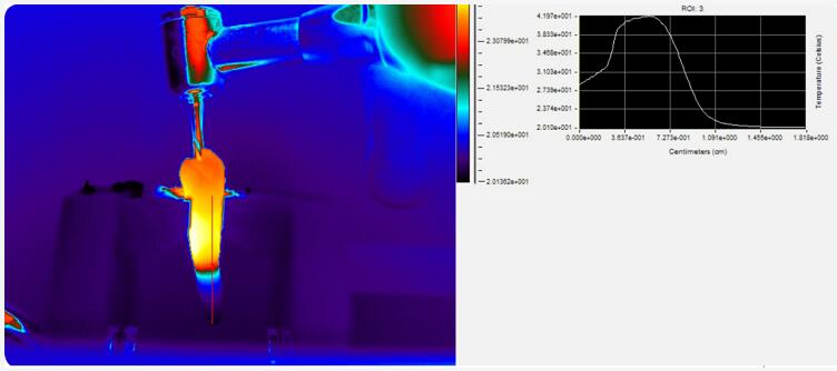 左圖:水冷鉆孔過程中牙齒的熱圖像 右圖:溫度圖