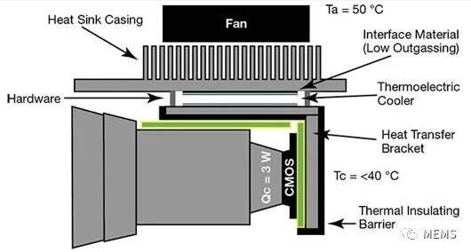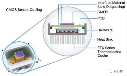 熱電冷卻器可將關(guān)鍵的CMOS傳感器溫度相對(duì)散熱器的熱側(cè)溫度降低約40°C