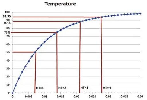 為了探討微測輻射熱計探測器的響應(yīng)時間,我們來打一個有趣的比方,假想有兩桶水:一桶是裝滿已攪拌均勻的0℃冰水,另一桶是100?C快速沸騰的沸水。讓微測輻射熱計探測器先對準(zhǔn)冰水,然后瞬間切換到沸水(100?C的躍階輸入),記錄這一過程的測溫結(jié)果。如果我們將10ms的熱時間常數(shù)轉(zhuǎn)換成一半時間以便于計算,我們得到的值大約為7ms。