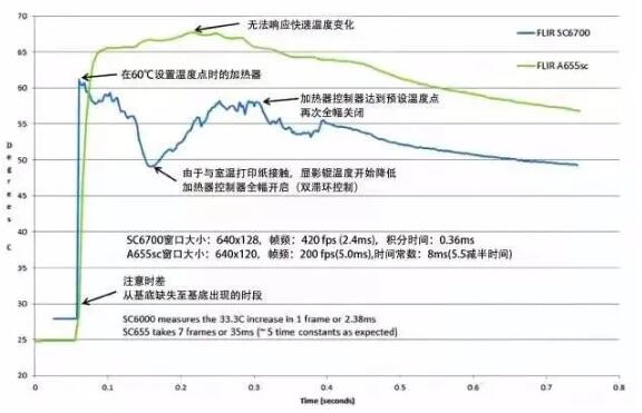 上圖表明,兩類熱像儀所獲得的數(shù)據(jù)明顯不同。微測熱輻射計熱像儀獲得的數(shù)據(jù)沿著長度方向表現(xiàn)出大而相對穩(wěn)定的突起。而光子計數(shù)熱像儀的數(shù)據(jù)隨著時間的推移,溫度明顯有所不同。制冷型熱像儀表明,經(jīng)過加熱的顯影輥組件在轉(zhuǎn)動的第一周時,由于與紙張接觸,溫度會有所降低。繼電器式控制器感應(yīng)到降溫后,會全功率開啟加熱控制器。最后,當(dāng)顯影輥加熱至預(yù)設(shè)溫度后,控制器會關(guān)閉加熱過程,由此反復(fù)進(jìn)行。一幅圖像足以幫助研發(fā)工程師確認(rèn)兩項事宜:檢測產(chǎn)品需要一臺光子計數(shù)熱像儀;如需獲得理想的設(shè)計目標(biāo),需要在加熱的顯影輥上加裝PID(比例積分微分)系統(tǒng),而不是簡單的繼電器式溫度控制器。
