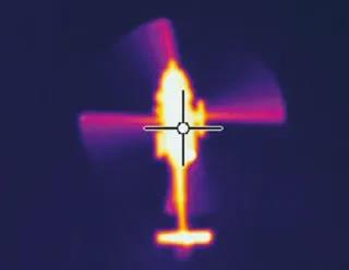 為了進(jìn)一步說明問題,來看最后一例:測量直升機(jī)螺旋槳的熱效應(yīng)。螺旋槳與空氣之間產(chǎn)生的摩擦?xí)刂菪龢纬梢欢ǖ臒崽荻龋娇拷~片尖端,溫度越高。使用非制冷微測熱輻射計熱像儀,無法有效地定格目標(biāo),不能準(zhǔn)確地描述和測量真實的溫度。