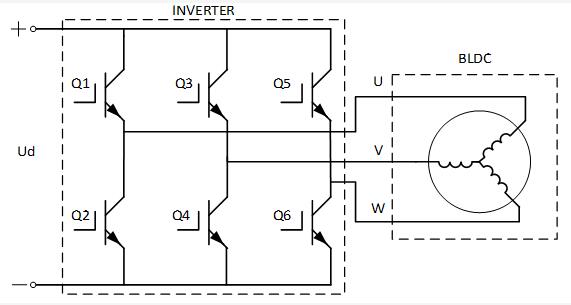 常見多旋翼無人機通常使用電子調速器作為電機的驅動部件,是一種比較常見的電機驅動裝置。電子調速器的主要通過PWM脈沖來實現(xiàn)三相激勵電流。典型的BLDC驅動如圖1.1所示。Q1-Q6是6個MOSFET組成的直流轉交流的逆變電橋,每只管子在驅動信號激勵下,有序開通和關閉,形成交流驅動源。