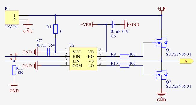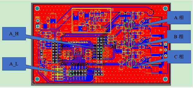 如圖2.1所示,該部分為電子調速器A相輸出,驅動器使用了集成電路。圖2.2是完整實驗板PCB,可以發(fā)現(xiàn)制作PCB板的時候由于走線原因,A相驅動線是兩根不等長的線,A_H線較長,A_L線較短。