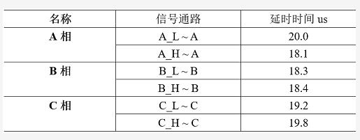圖3.1中可以觀察到A_L端信號通過線路及驅動器件后產(chǎn)生的時延。信號在下降沿部分產(chǎn)生了彎曲變化,這可能是線路上分布電容引起的。對所有驅動端分別激勵并測量出每個通道的時延。表1給出了各個通道測量結果,可以看到B相和C相近似相等,A相最差。從PCB電路上可以發(fā)現(xiàn)A相兩路信號對稱性最差,B相和C相接近一致。A相有約2us的時延差別。