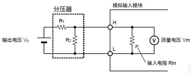 測量的是分壓器輸出的直流電壓,H、L是GP20輸入端子,分壓器的內部電阻R2和模擬輸入模塊中的輸入電阻Rin并聯,會產生一個新的組合電阻R',導致測量電壓Vm產生測量誤差。